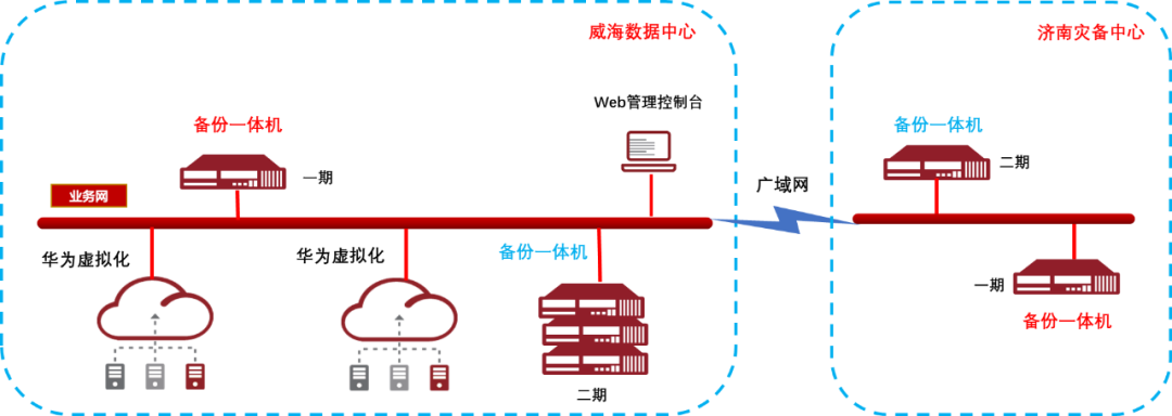 2、雙中心容災(zāi)解決方案:在威海、濟(jì)南兩個數(shù)據(jù)中心之間統(tǒng)一管理,采用鼎甲數(shù)據(jù)備份和管理軟件,將區(qū)縣政府業(yè)務(wù)系統(tǒng),通過云平臺接口統(tǒng)一備份到鼎甲備份一體機(jī)上后,將重要備份數(shù)據(jù)異步傳輸?shù)綕?jì)南災(zāi)備中心,實(shí)現(xiàn)數(shù)據(jù)級容災(zāi)。