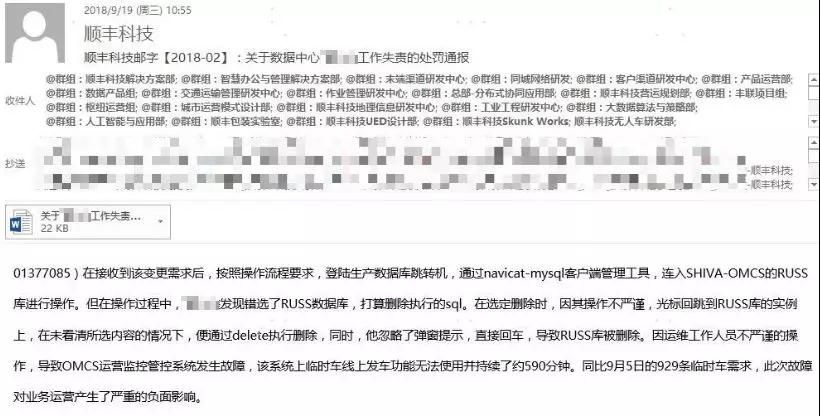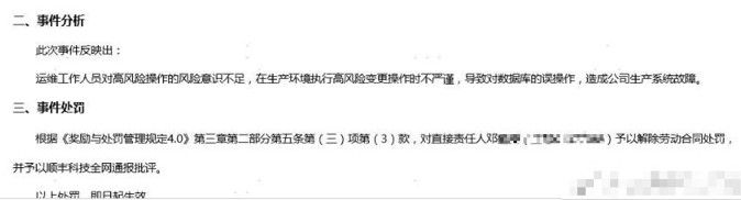 昨日,從順豐傳出來(lái)的這封郵件傳遍IT圈,簡(jiǎn)意是:一位高級(jí)運(yùn)維人員搞錯(cuò)了一條命令,誤刪了某個(gè)數(shù)據(jù)庫(kù),數(shù)據(jù)無(wú)法恢復(fù),后果太嚴(yán)重了,順豐只好讓他被動(dòng)跑路。