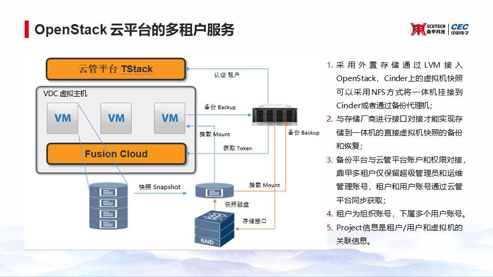 那我們可以看到,如果要實現OpenStack 云平臺的多租戶服務,我們做了什么呢?首先第一個,如果你要實現剛才我們所說的不需要備份代理機,而云平臺又沒采用通用的架構,它采用的是外置存儲通過LVM接入的OpenStack。鼎甲多租戶僅保留超級管理員和運維管理賬號,租戶和用戶賬號通過云管平臺同步獲取。
