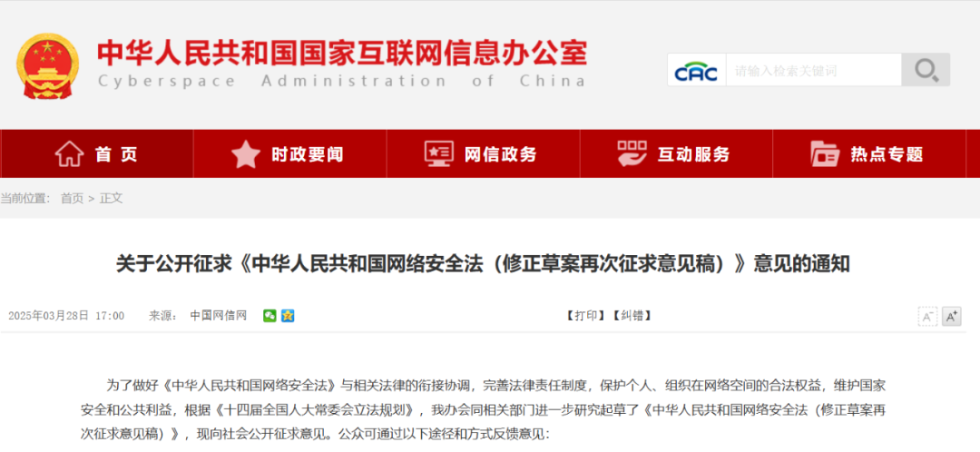 2025年3月28日,《中華人民共和國網(wǎng)絡(luò)安全法(修正草案再次征求意見稿)》發(fā)布公示。其中新增條款明確指出:
