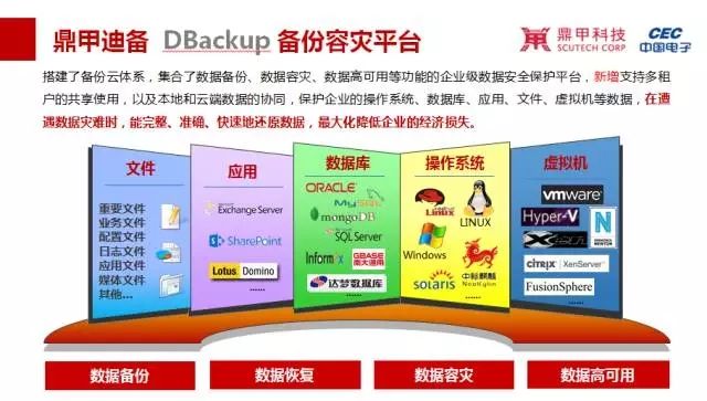 鼎甲迪備( DBackup )搭建了備份云體系,集合了數據備份、數據容災、數據高可用等功能的企業級數據安全保護平臺,支持多租戶的共享使用,以及本地和云端數據的協同,保護企業的操作系統、數據庫、應用、文件、虛擬機等數據,在遭遇數據災難時,能完整、準確、快速地還原數據,最大化降低企業的經濟損失。