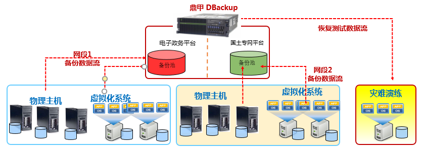 針對電子政務與國土專網兩大平臺,采用鼎甲DBackup平臺,進行備份存儲池的隔離。最終實現兩大業務平臺,一套數據保護系統的方案架構。利用迪備軟件的高并發多通道的技術,將原有生產主機的數據備份時間由原來的5小時縮短至1小時,減輕了對生產主機備份帶來影響。為了驗證數據可靠性,所有集中保護數據通過災難恢復演練平臺自動驗證,確保數據始終正確可用,獲得好評。