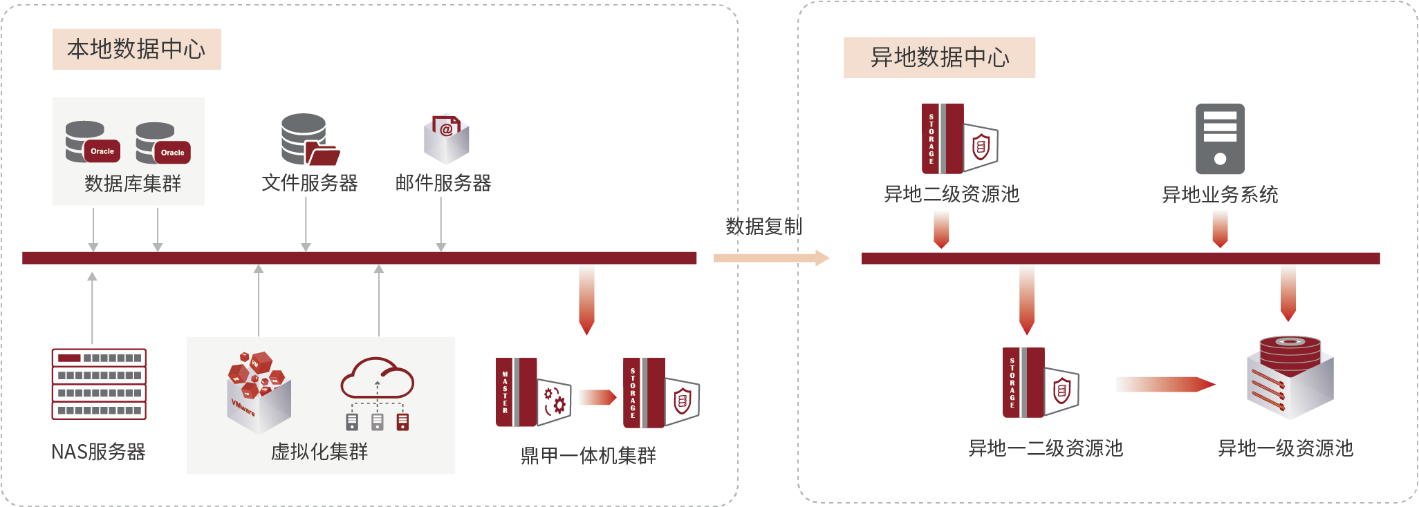 整體方案部署了18臺(tái)備份一體機(jī),單臺(tái)容量達(dá)300TB,現(xiàn)已實(shí)現(xiàn)3PB數(shù)據(jù)的集中備份。通過(guò)鼎甲的數(shù)據(jù)備份平臺(tái)對(duì)中行的數(shù)據(jù)進(jìn)行備份,在備份之后的數(shù)據(jù)通過(guò)一對(duì)一的復(fù)制鏈路,實(shí)現(xiàn)主信息機(jī)房到方山容災(zāi)機(jī)房的數(shù)據(jù)級(jí)容災(zāi)。